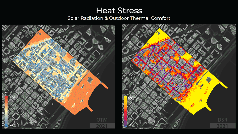 Comparing how is going to be the behavior in the future we can have a central idea of the main risk areas to intervene in the district of San Martí in specific the area of Poblenou. The Outdoor Thermal Comfort is measuring the temperature in the ambiance and the Direct Solar Radiation the percentage of heat sun in the surface.