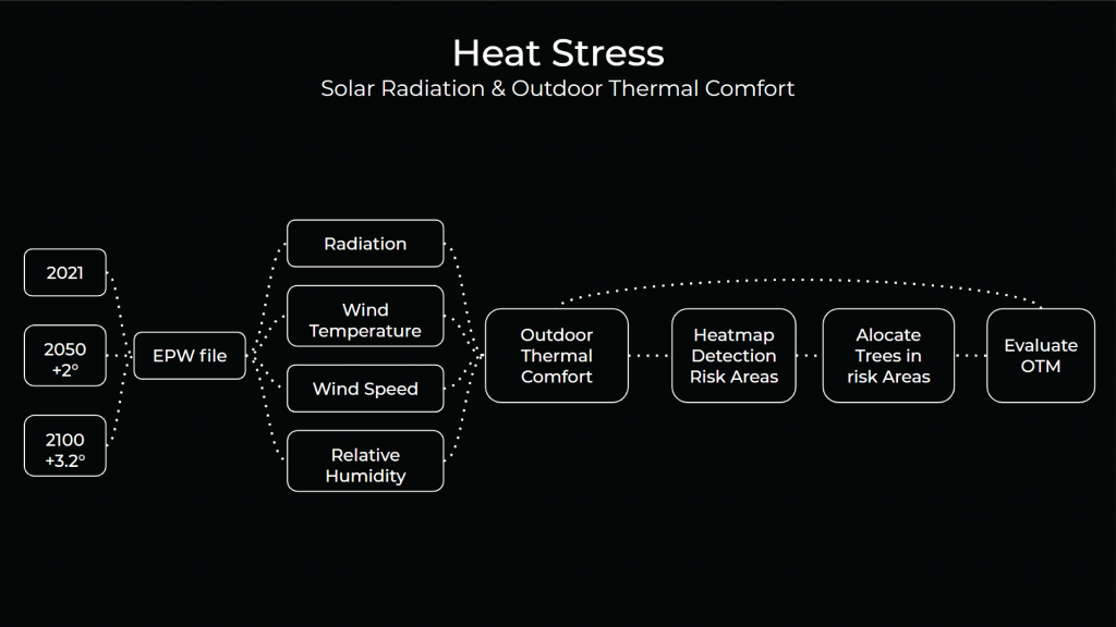 For calculating and analyzed heat stress, we manipulate an EPW file which is an EnergyPlus Weather data which is mainly used for environmental simulations of climate, by using a program called “Elements” we modify the temperature and radiation by the expectancy of growth of Barcelona’s city council which are 2° celsius for 2050 and 3.2° celsius for 2100, then by using grasshopper with the plug-in call “ladybug” we create simulations for Direct Solar Radiation and Outdoor Thermal Comfort.