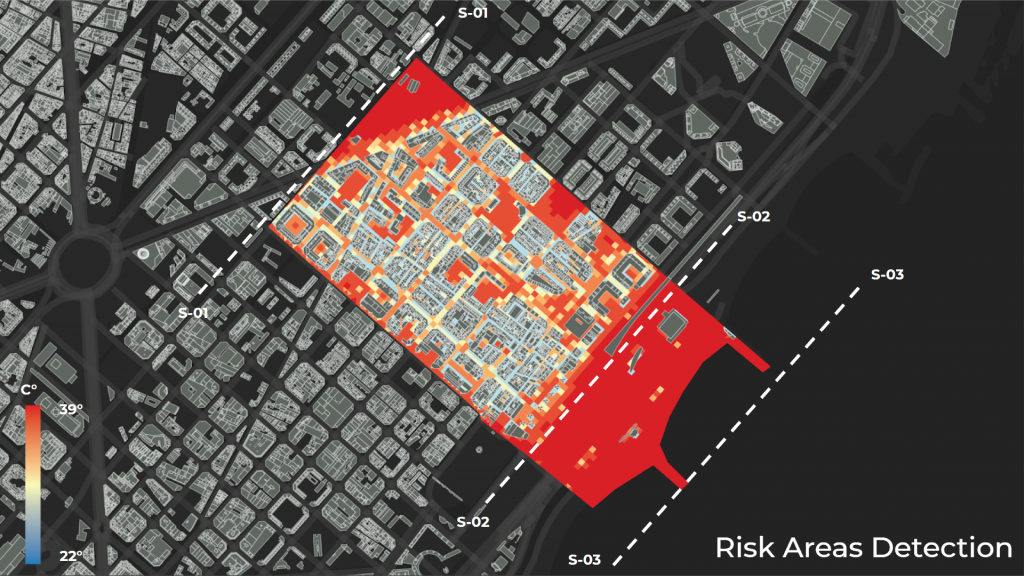 With the map of risk areas, we create sections to divide the urban fabric from the beach zone and then we focus the interventions between the sections S-01 and S-02, to reduce heat stress inside the district.