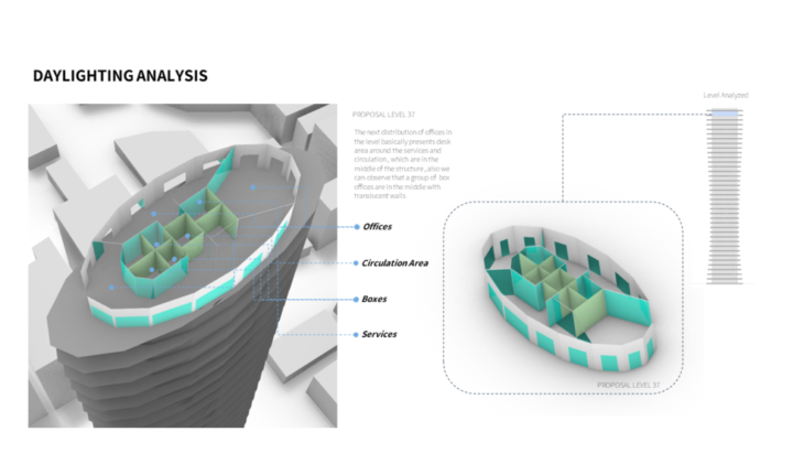 La Paz is the third most populous city in Bolivia. It perches at 3,650 m above sea level, making it the highest capital city in the world. Sopocachi is a bohemian neighbourhood in La Paz and a concrete jungle. We proposed a 30-storey mixed-used tower with terraces to introduce green space in the neighbourhood. Our design intention was to incorporate environmental analysis in our workflow to develop parametric design of the façade maximising the use of daylight and natural ventilation.