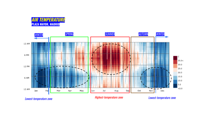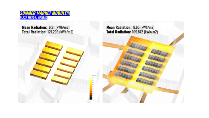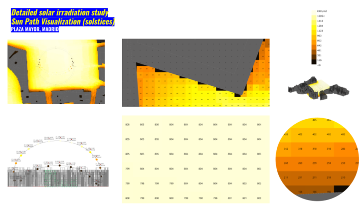 We used solar irradiation analysis to map with a grid 5×5 meters the main surface of Plaza Mayor. By this process we were able to understand the interaction between the main surface and context buildings. How these values increase in the center of the Plaza and help us to understand the consideration for hour design. These Considerations are for example if some modules are for a market or sales we suggest to avoid artefacts/devices that can melt, by this protect the merchandise from users and avoid losses on their revenues during this season.