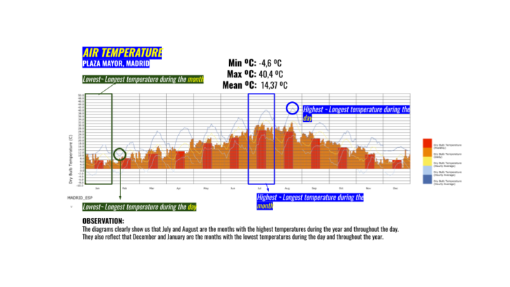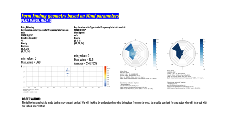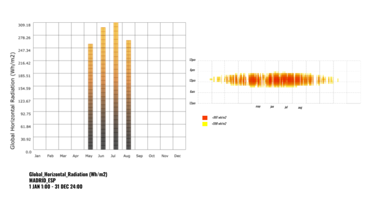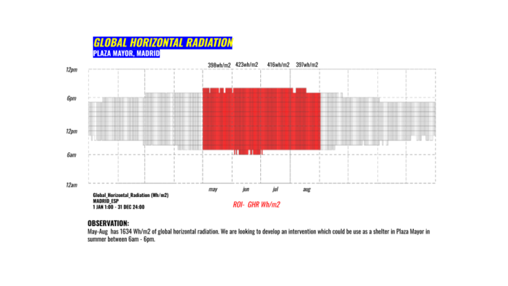 The following analysis helps us to understand the specific time we are interested in our intervention in Plaza Mayor. Between May and August, results point out a minimum of 397wh/m2 during August, 423wh/m2 during June and an average of 408.5wh/m2. These values were generated from 6am to 6pm. Basically this gives us a starting point for our design intention in order to handle these values for a comfortable experience with the different actors that will be part of the intervention.