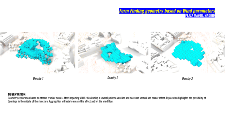 Next we explore wind speed and the interaction between our voxelize shape. 3 splitted options for voxelize exploration. Trying to avoid a massive geometry that could affect the surroundings of the plaza. We increase the density of voxels and random seeds in tree steps. But didn’t find any specific improvement the 3 of them develop pressure that will affect any actor walking beside the intervention. For this density step we runned the simulation for the voxelize geometry without context building.