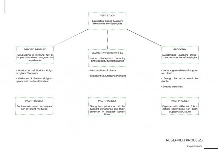 Epiphytic Tessellations aims at exploring the use of acry-polymer gels to develop a sustainable water absorption and storage facade system for buildings, on which plants can grow. The system is designed with the help of digital optimization and additive manufacturing to generate a plant specific support system with graded fibrosity, guided by the requirements of the of the plants.
