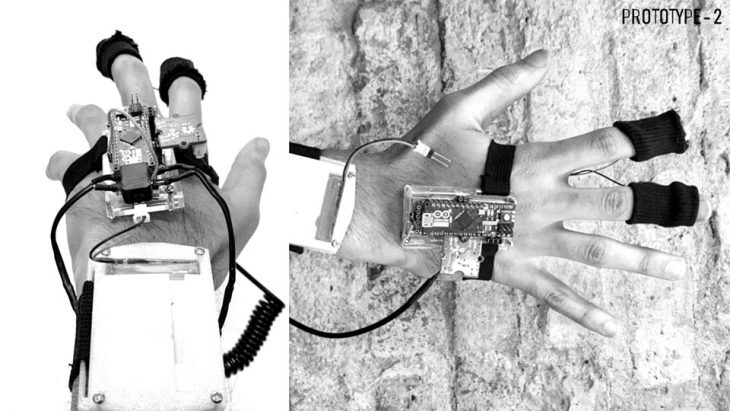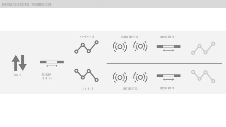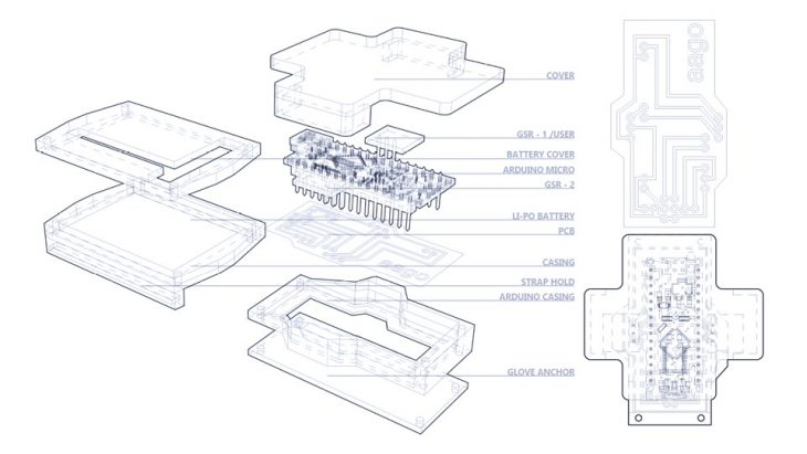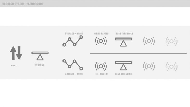 These sensors are placed on the glove one facing externally to collect external data and one facing towards the user itself the process starts with a gesture as a hand shake or just a touch with the person he/she is interacting with the raw processed data from the GSR sensors is logged in and fed to the experiencer through a feedback system of haptic devices along the wrist. To synthesize the data user compares their emotions(data) with their partner’s emotions(data) to give a broader sense to the conversation.