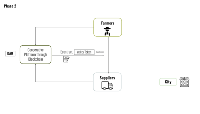 Farmers first need to register in the cooperative platform then they will be set up by a wallet and they get the membership to vote for their representatives which uses utility tokens 1 FMP (Farmer Power Token) to vote, they could perform their transaction on the network with asset tokens which these asset tokens are backed by real agricultural product for instance 1 FMP is equal to 1kg of potato. Through the platform, they receive the data on market demand and what the market needs do they focus on those products more.On the other side of the structure, there are suppliers who are responsible for transportation, packaging, selling, and storage. They are individuals who have one or more of these services. As of the city intervention, the spare spaces are going to be filled with agricultural products and new selling hubs would be opened like open area markets. The suppliers also connect with supermarkets to sell their products with the certificates that cooperative platforms give them. This way every individual with one of the services that they could provide will have a job. And finally, a cooperative platform sets them an individual wallet for them to receive their commissions and payments in asset tokens of the actual FMP asset tokens.