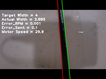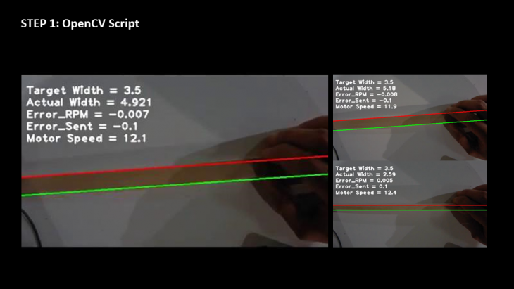 STEP 1: OpenCV Script : A straightforward OpenCV script in Python, involving the detection of two parallel lines. Based on the number of pixels and the distance, we can calculate the actual distance between the two detected lines. Based on the extrusion width we require, an error can be calculated which can correspondingly be related to a change in RPM. A simple proportional controller is used to calculate this correspondence.