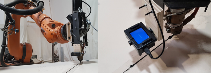 SETUP: A Kuka KR-150 was used with a WASP pellet extruder. A small action camera was mounted about 8cms away from the extruder so that it could view the recently printing path (with a slight delay)