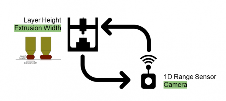 HOW: Geometric parameters like layer height and extrusion width were ideal for feedback. Layer height is material independent and thus remains constant. Thus we chose to control the extrusion-width.
