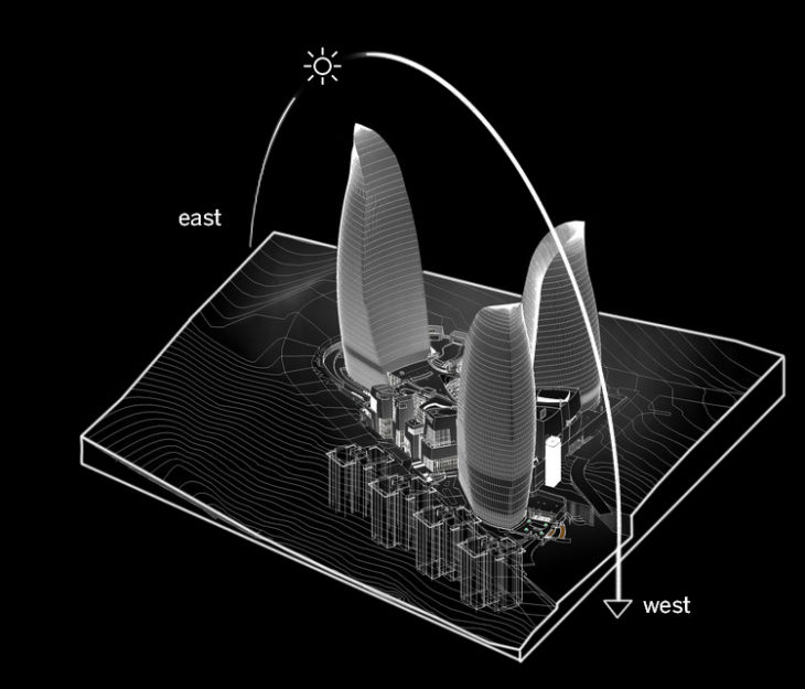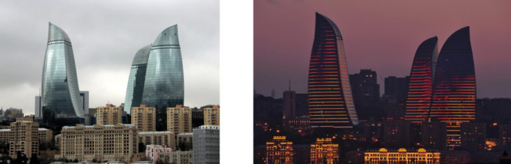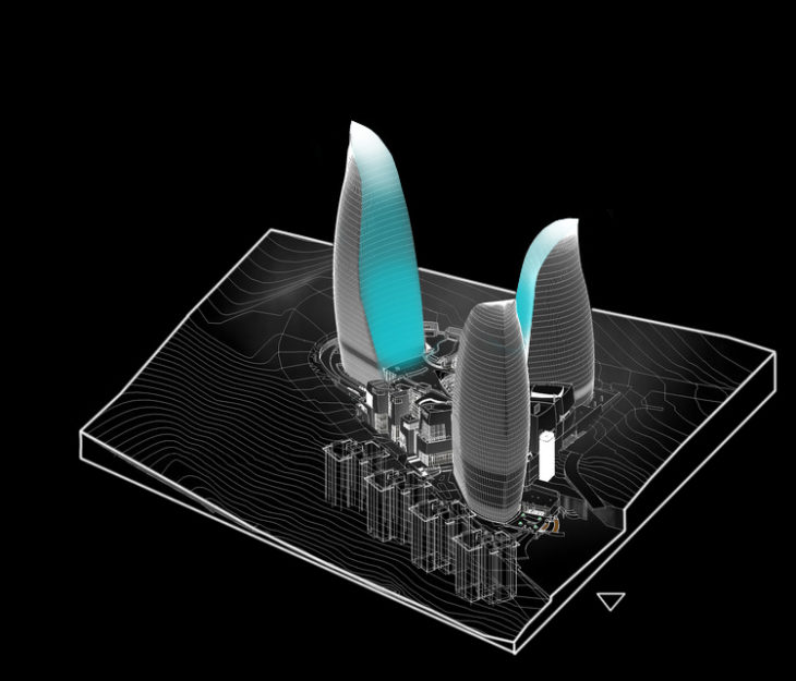 ‘Land of fire’ is adopted motto of Azerbaijan. Flame Towers is the best representation of this aphorism in architectural way. Towers are situated in the capital of Azerbaijan- Baku. The three flame-shaped towers symbolize the element of fire – historically resonant in a region where natural gas flares.