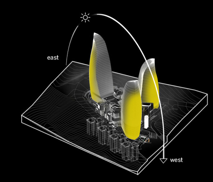 Here are the parts colored with yellow illustrates the sun exposure surfaces, so we are going to apply parametric facade to these places.