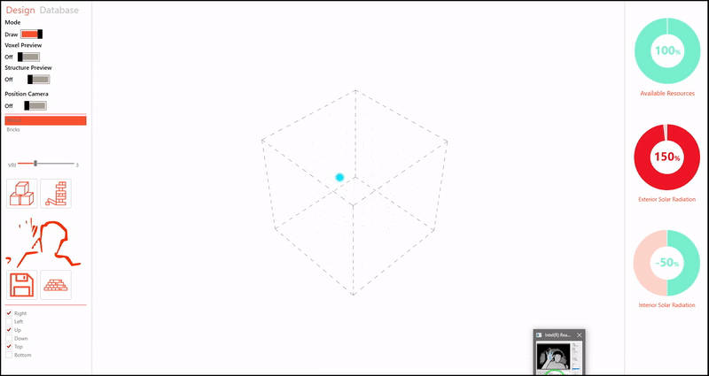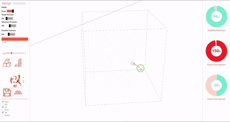 The user inputs are points in a 2D grid, this points define the volume that gets voxilized in further steps and can be controlled by hand tracking and gesture control. The previewed geometry color changes based on the resources availability, in this case a limited amount of wood battens to build a structure. A “GAME OVER” sign appears every time the user exceeds the quantity of material available.