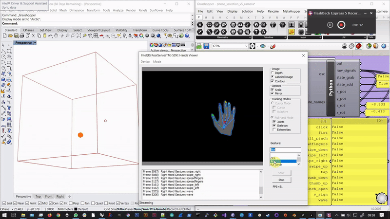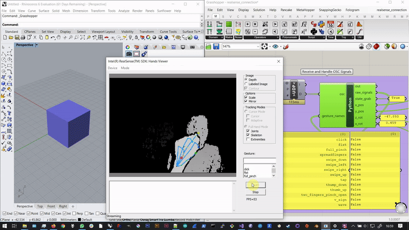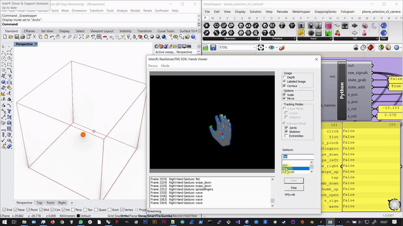 Hand Gesture Detection using Realsense technology inside Grasshopper.