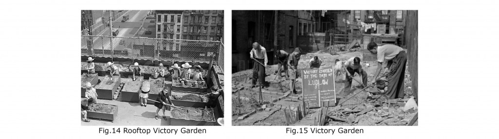 When food became scarce during the Wars, governments encouraged people to plant their own food. People were taking over any possible free space from parking lots to roof tops and even window boxes. However, when it was no longer a necessity people forgot about these gardens. For a period of time food production was a parasite in our cities redefining the urban tissue.