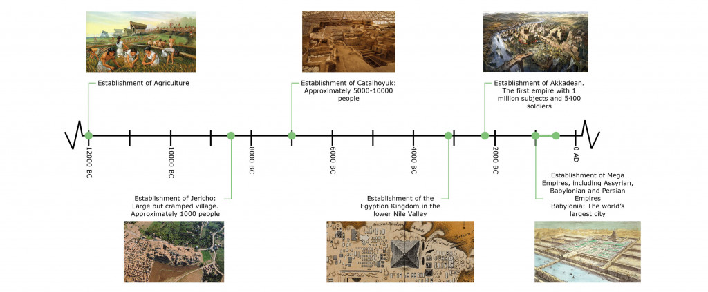 Approximately 12ooo years ago the agricultural revolution forms the first settlements. The nomadic way of life was no longer supporting the expanding population, and thus people began to tame plants and animals. This is what we know as farming. As food production thrived, population continued to grow paving the way for cities, kingdoms, empires and mega empires.