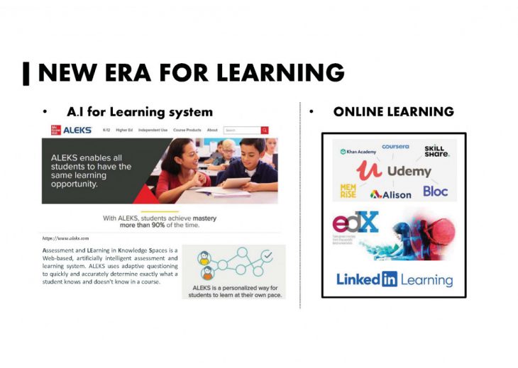 I’d like to call this, ‘New Era For learning’. The quality of education was generally quite different depends on financial condition, location, etc. But today, thanks to the development of technology of internet and A.I, the barrier of learning is getting lower than before. For exemple, ALEKS company made a A.I system for kids to help find out their weakness on subject then it keep notice them to catch up the weak part. In the end of the course, students achievec more than 90% of the time. In my case, I learn often via EDX bceause, we can have a high qulity of the university course for free. But there is also certification coure if user pay for it which is I prefer because of the feeling of achievement.