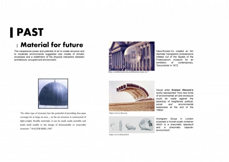 From 1950s, air was considered as a material. Walter Bird had constructed the world’s first air-supported radar cover in 1946 and 1955 then constructed a pneumatic enclosures for tennis courts and swimming pools. Utopian groups in 1960s including Archigram and Haus Rucker used often pneumatic structure for their project experimental.