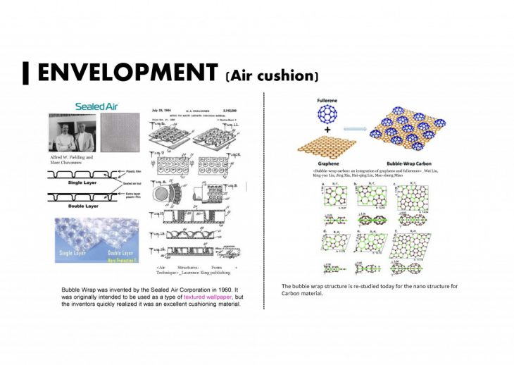 In fact, the idea of air cushion has started by a paper company , Bubble Wrap in 1960. They found this structure system accidently. Then This idea has developed in different sector and even today, we see the study in nano structure for carbon material.