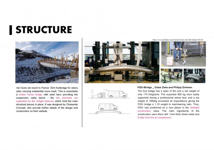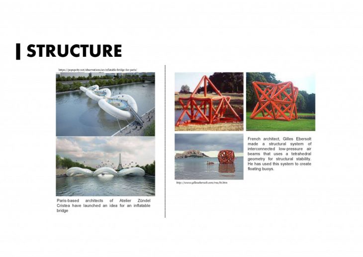 Today, Air material is mixed with other materials¨. On the light side, the bridge has made by wood, cable and air ballons. And On the right, we see that a bridge made by a new material of inflate sheet metal which is also functional construction elements.