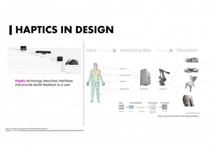 What it haptic? Haptic technology describes interfaces that provide tactile feedback to a user. Haptic technology is deeply related with the sensors or equipment. Image On the right side, showing how the sensors may can improve or join in design process. We see incredible potential in the field of haptic to create new experiences that engage our most primal and personal mode of perception, our sense of touch.