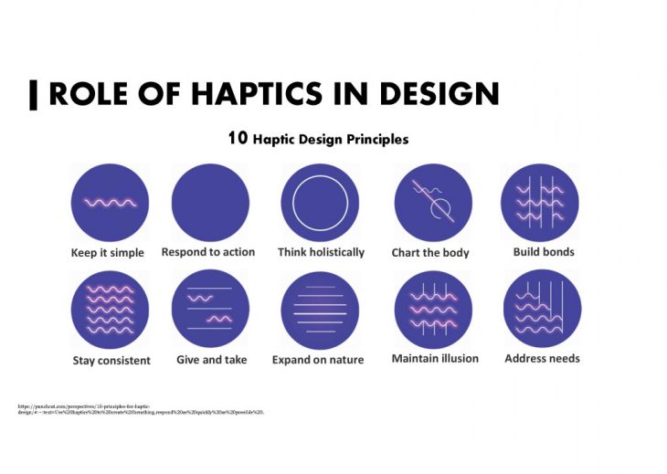 Complementing the Haptic Design Framework published by Immersion, the principles build upon a growing discipline in haptic design thinking focused on designing purposeful, interactive touch experiences. The principles provide a thought process for tackling haptic design and incorporating more tactile elements into product design. In my point of view, during on the principles above, 4 rules below are fundamental for Haptic design thinking.