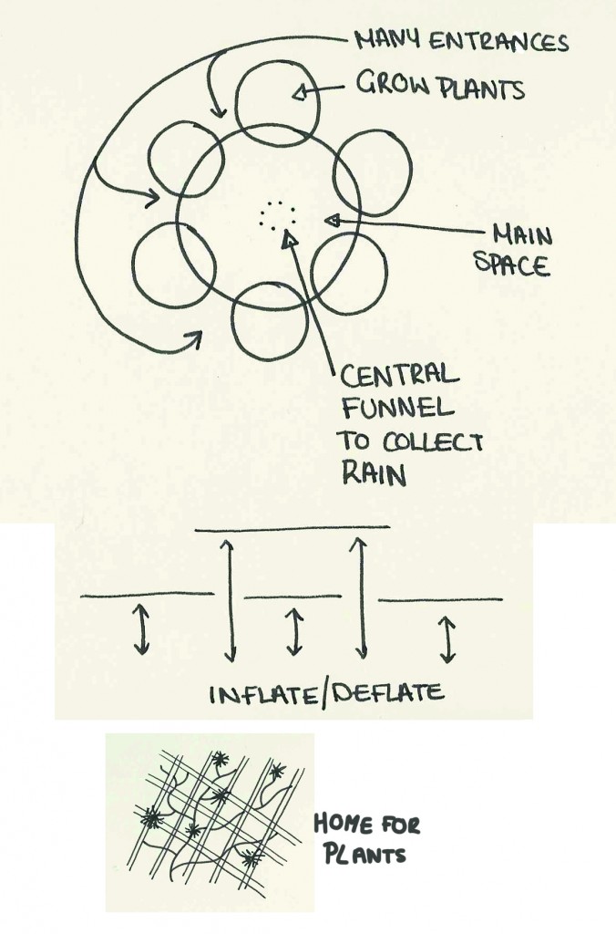 Depending on the needs of the space and the types of plants chosen to grow the structure can inflate or deflate by changing the loads. The central funnel can be manipulated to serve the needs. If there is a lot of rain it can be made wider, or smaller if there is no rain. By adding more anchor points to the outer edge of the structure, the form alters slightly and becomes more dome like.