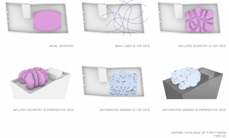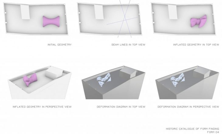 Inflation simulation is used as a form finding technique in order to represent a three-dimensional shape that will be fabricated by fabric, and in which later on concrete will be casted in to have the final form. The seams of the fabric are designed in a grasshopper “game” where the “player” can modify the final shape using lines, polylines and curves, having total control of the final proposal. During the same game the player controls the overall shape and size of the final construction. REFERENCES