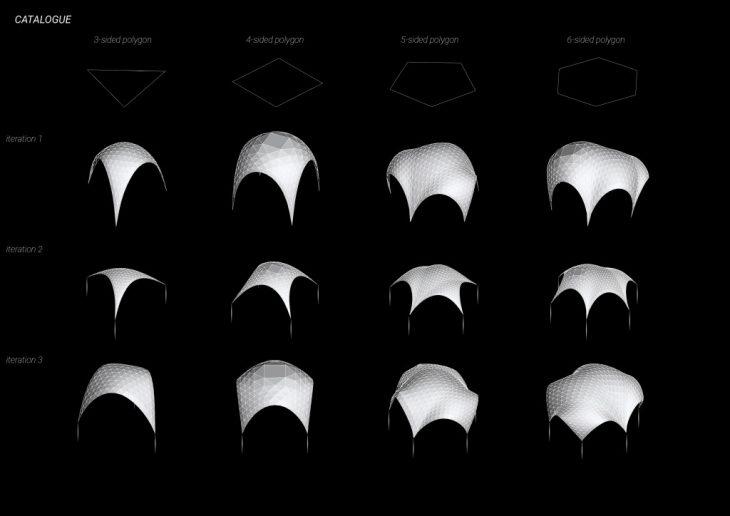 4 Different base geometries were chosen for the pavilion space. An exploration of pressure, anchor points, loads and extension of anchor poles were applied to the base geometries. The mesh was triangulated in order to get an interesting tensile shape between the anchor points.