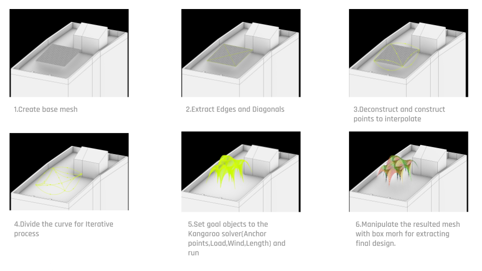 The idea of morphing the natural forces is done through the kangaroo plugin engine. The idea was based around the manipulation of a tensile structure with the natural elements like gravity, pressure and wind. The geometry is iterative in a way that it reacts based on the anchorage or the anchor points that the structure is connected to, with relation to the natural forces. The mesh is a simple rectangle where the edges and the diagonals act as the harbor for the anchorage. By manipulating and deforming the curves and the number of anchor points this project moves forward.