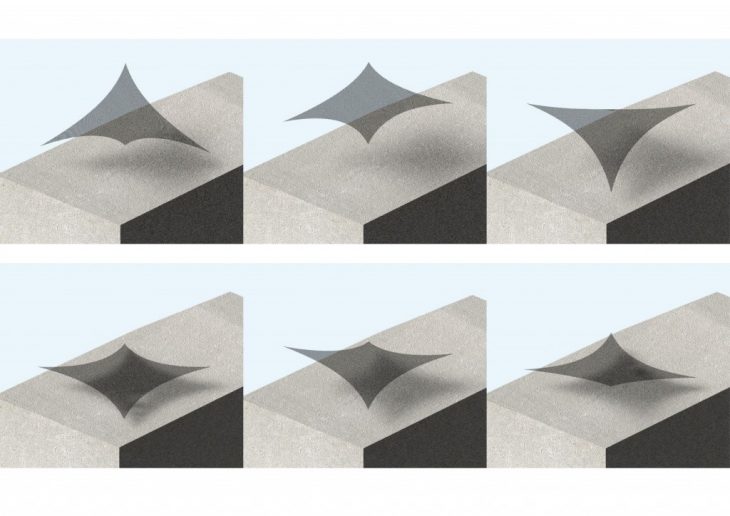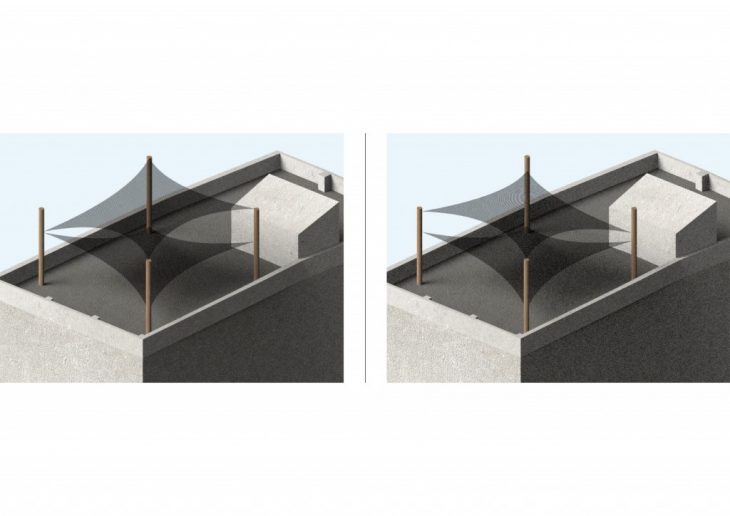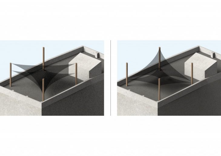 Taking influence from Frei Otto, the installation is two suspended hyperbolic nets, creating a large shaded hammock bed. Located on the rooftop of Iaac, this installation, in theory, would be ideal for any student needing a moment to relax in the Barcelona sun.