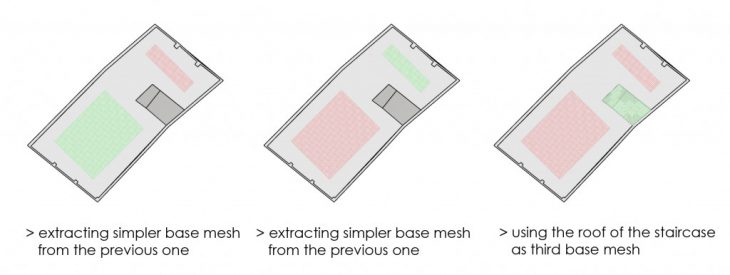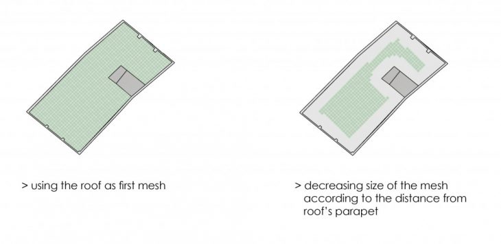 The main idea was to compute different shapes with a single concept. Indeed, every mesh doesn’t touch the floor; in this way, the lightweight structures connected to the parapet can play a shading role.