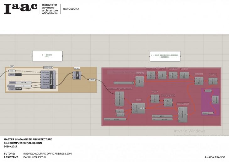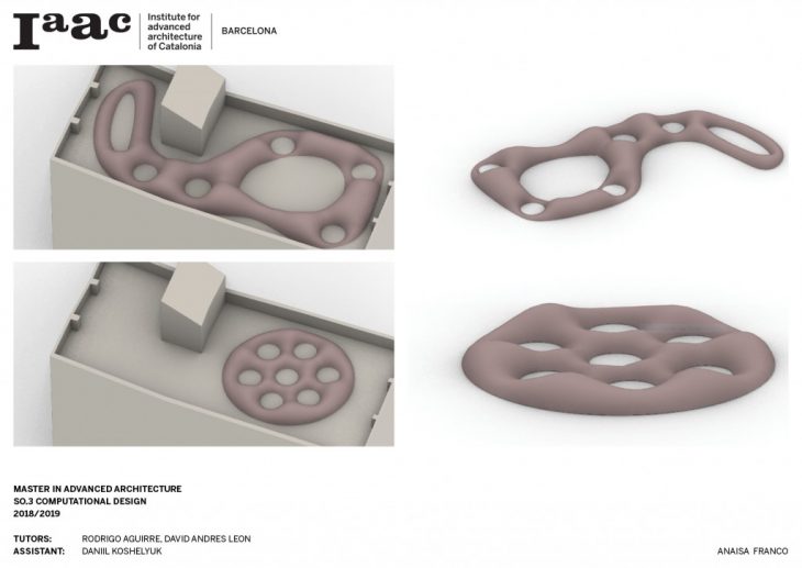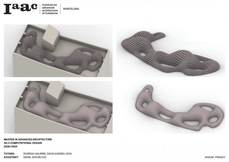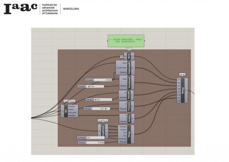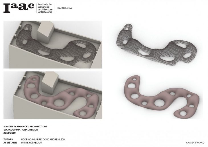 The aim of this assignment will be to create an live-interactive installation using forces as parameters using Kangaroo as main engine. The main goal will be to build a simple interface where the user can “play” with inputs such as attractors, sliders, functions and time to transform an object in space. The selected location for the installation will be the IaaC rooftop area. see references below.