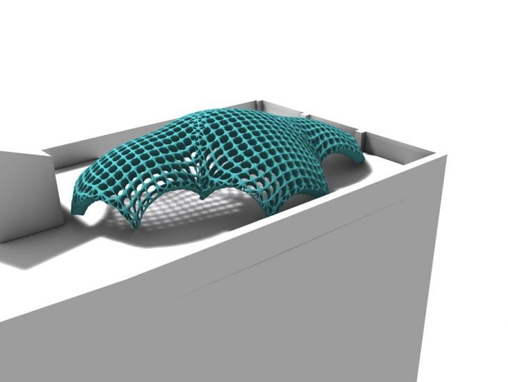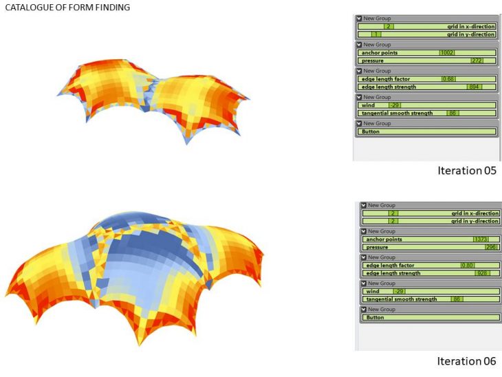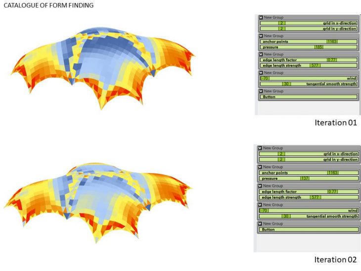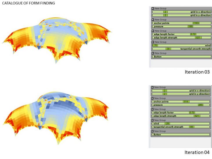 Various iterations of the tensile structure are achieved by varying these parameters.