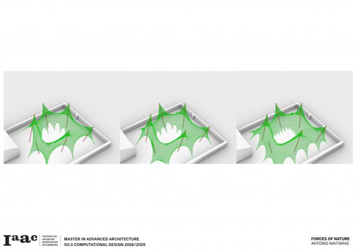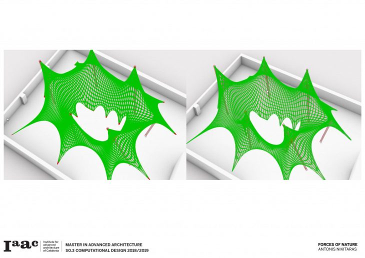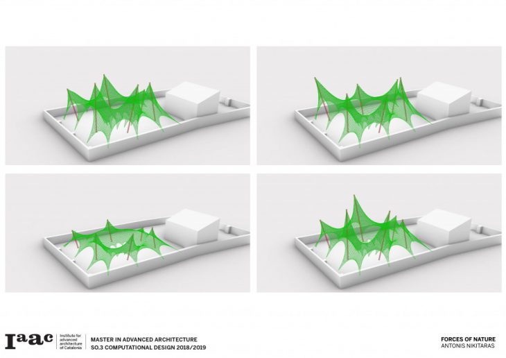Forces of nature makes use of grasshopper plugin kangaroo to design a tensile structure on the roof of the IAAC building. Through the use of this parametric tool, the proposal becomes a live interactive installation using forces as parameters through the kangaroo engine.