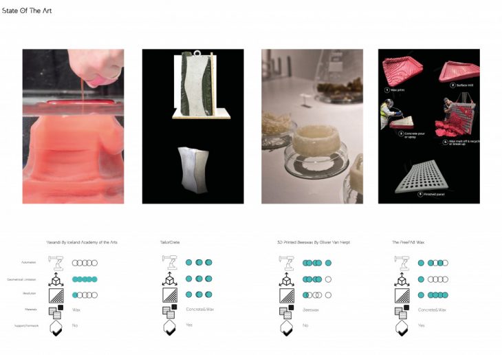 Formwax is a project looking for ways to take advantage of 3d printing with concrete. With the usage of wax, more complex shapes can be printed while the wax can be used over and over again which offers a more environmentally friendly solution compared to existing solutions.