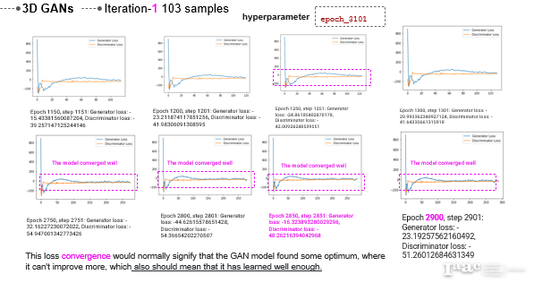 Then, Iteration 2 successfully runs to epoch 10,000. However, the best convergence appears at epoch 5400 and 5450, with generator loss of 32 and discriminator loss of -42 at epoch 5400, while epoch 5450 shows generator loss of 35 and discriminator loss of -39.