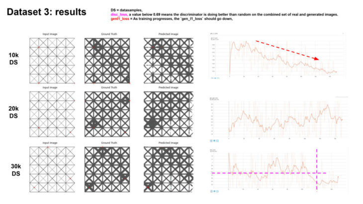 the first test of dataset 2 with pix2pix gave already promising results. after 1.000 epochs the gan was already able to learn and generate the desired patterns from 3 supports. however, after 30.000 epochs the learning seemed to have reached its peak, therefore we wanted to increase the predictability by adding the structural grid in dataset 3.