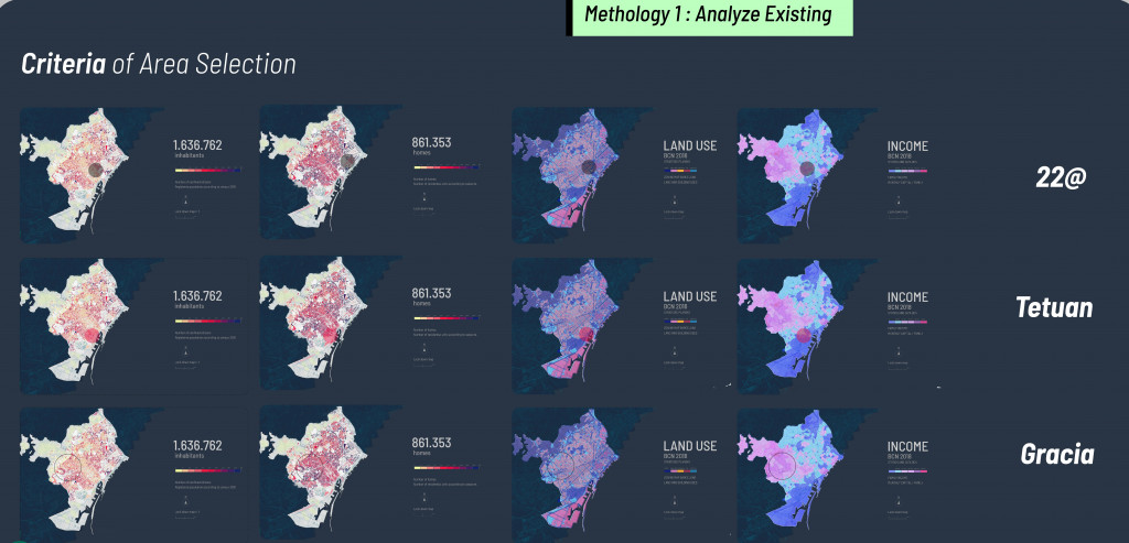 The important parameter for selecting the area is income; the selected area for low income is 22@ for researching the design strategy for Catalog of Genesis because this area will be used for food genesis mainly in the city, Plaza Tetuan is selected for medium income to design the food management system and Gracia is selected for high income to understanding consumer behavier.
