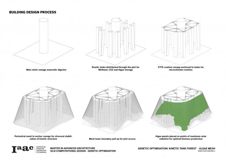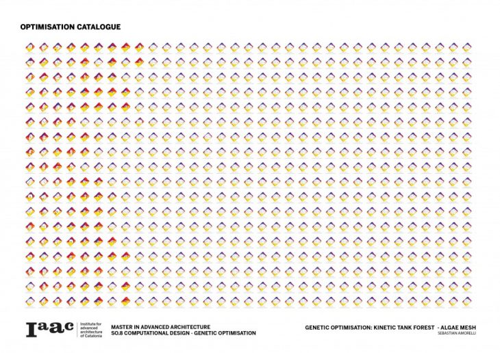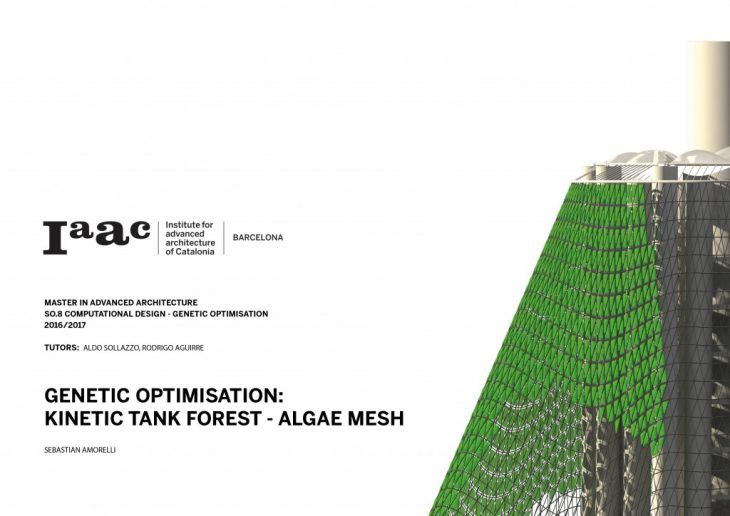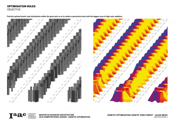The Grasshopper Galapagos Evolutionary Solver follows the principles of genetic heredity combining and iterating different solutions so as to maximise or minimise a desired value. Utilising Galapagos an evolutionary algorithm was developed to optimise the building design for the Self Sufficient Buildings Studio. The code was elaborated to find the optimal configuration of tanks within the building so as to obtain a perimetral mesh with the maximum area of high solar radiation where algae panels will be distributed for biomass production.