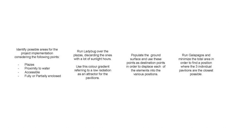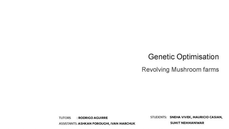 The Revolving Mushroom farms is a project that aims to provide a source of food that can be grown in public spaces in areas that are too cold and dark to grow regular crops. The project takes advantage of genetic optimization algorithms to find the best location for the structures in order to displace them within various plazas and courtards in order to find the best location based on the mushroom’s needs.