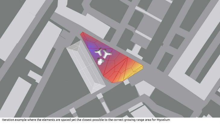 The farms are designed as tri lobed funicular structures with varying heights. the underside of these structures is lined with panels of mycelium of various species of edible mushrooms. For the mushrooms to fruit they need to have a reduced solar exposure wich was achieved through a solar analysis that was run in the city. Using Galapagos, we identifies the best possible locations for these structures that put them in the darkest areas available.