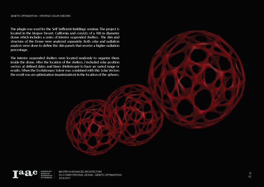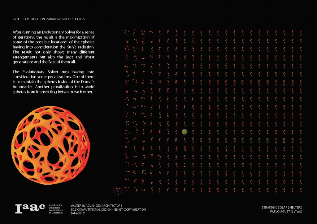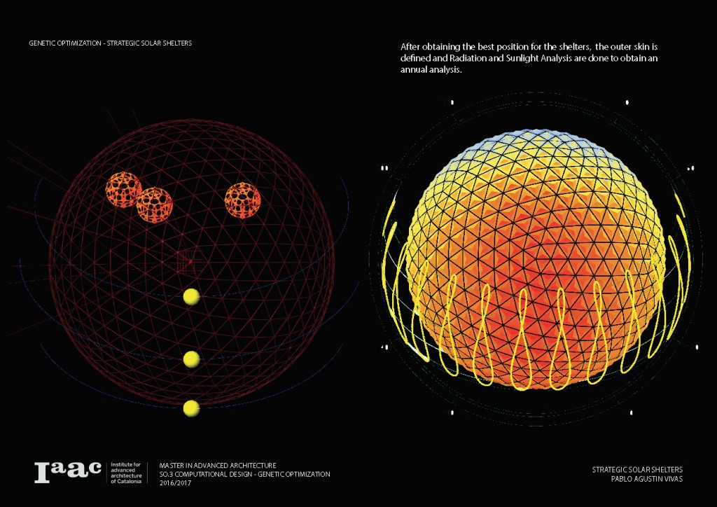 The interior suspended shelters were located randomly to organize them inside the dome. After the location of the shelters, I included solar position vectors at defined dates and times (Heliotrope) to have an varied range or results. When the Evolutionary Solver was combined with this Solar Vectors the result was an optimization (maximization) in the location of the spheres.