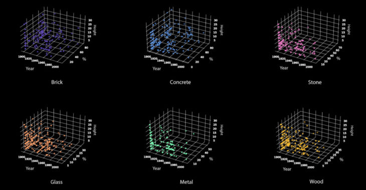 A bubble chart animation is generated to compare the relationship with a number of parameters (material, building age, height, current use). The user can select to play the animation for either “material” or “height”. For ‘material”, a scatter plot is animated and for “height” it is a bar chart. The bubble chart animation shows the use of “Percentage of Brick” against the use of “Percentage of Glass” of the selected buildings for extraction according to the building age (ranging from the=year 1900 to 2006), coloured according to their respective land use and sized by the height of the building. The animations are designed to work in an uninterrupted manner when each row of input is present across all animation frames, and when categorical values respond to the mapped symbol, color and facet constantly across all frames. The loading page is defined as a ‘cube’. The function “update” is then used to visualise the animation better.![]()