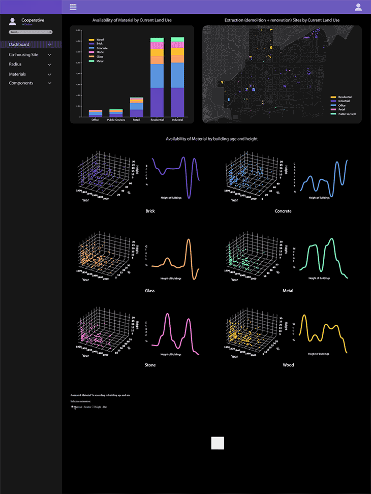 The aim of the exercise is to design a dashboard to support a part of the urban mining project developed in the Internet of Buildings design studio. The project offers a platform for the use of constructing cohousing projects around the city of Barcelona and bringing all the stakeholders to a single platform. The platform’s main objective is to create a circular strategy for the construction and demolition process. The platform would incorporate the “dashboard” for this purpose where users can access information regarding available buildings for demolition, their location, age, height, perimeter, the percentage of material composition they consist of and their current uses.
