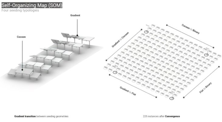Once analysised, four final typologies were picked according to aesthetic, structural and functional criteria. This four typologies became the seeding geometry for a Self-Organizing Map to construct a diverse catalogue of in-betweens.
