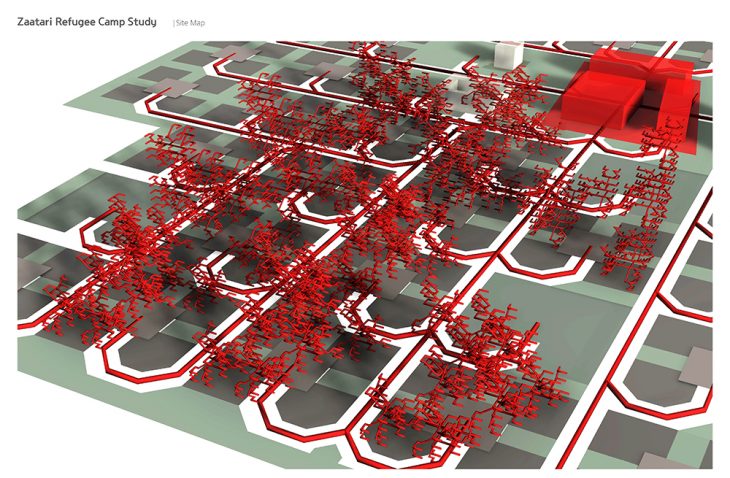 Zaatari Refugee Camp has an organic structure in the west area. Its urban structure looks like a plant because the structure was grown from the first distribution centre where refugee could take food and some stuff. This growing structure is responsive to lots of factors such as sunlight, distance, transportation, population and so on.