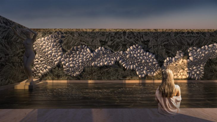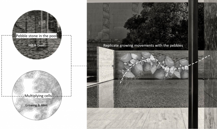 Since built in 1929, the Barcelona Pavilion hasn’t changed anymore. Time is frozen in this building. It is undoubtedly monumental.I hope my intervention will be an organic life form that will leave the mark of time as it is growing.