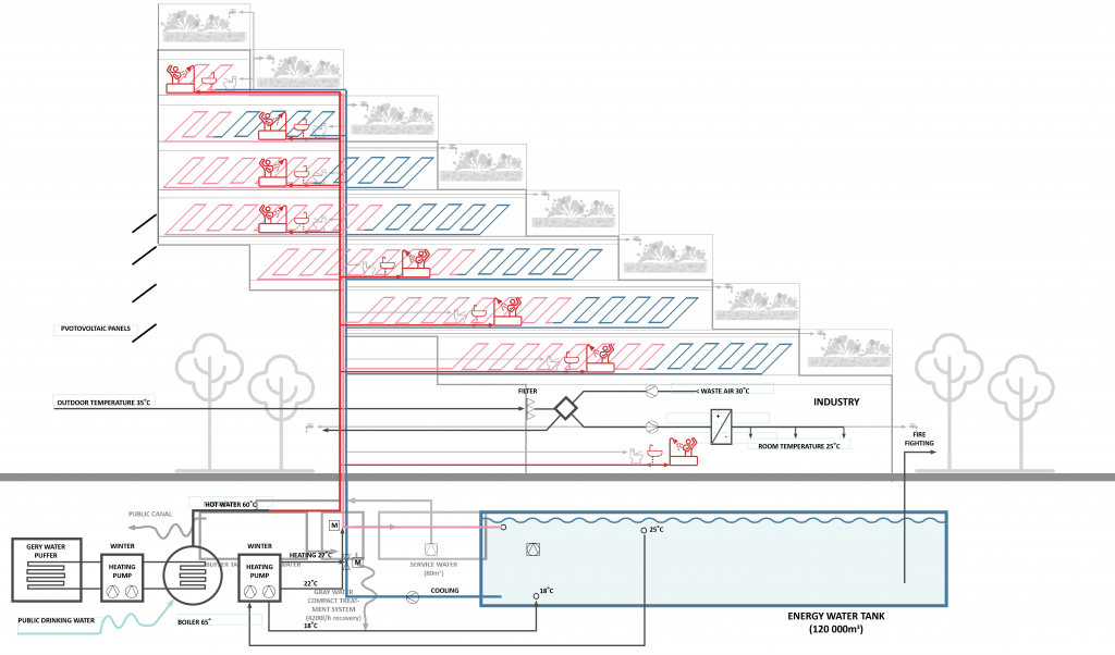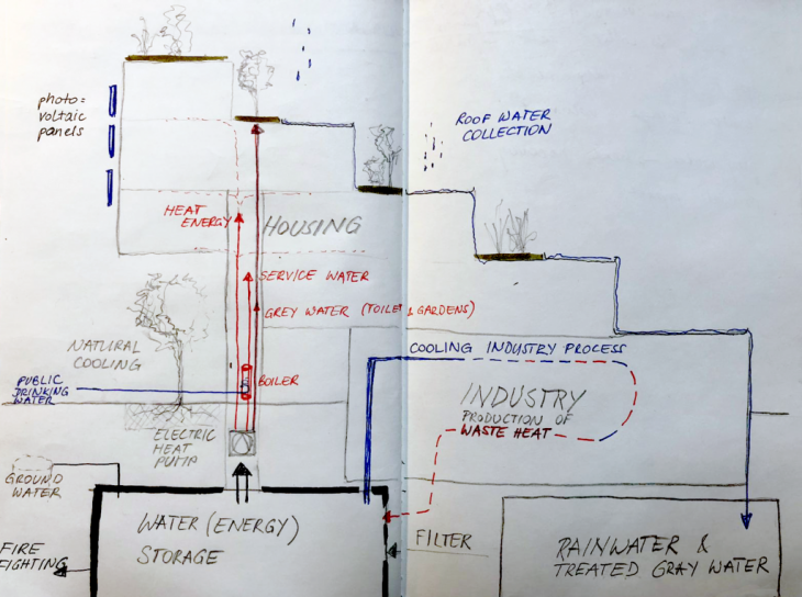 Water was already used as a thermal storage medium in ancient times, because water has one of the highest heat capacities at 4.2 J/(cm3K). Whether for cooling or heating, today’s technology (heat pumps) makes it easy to extract the required heat or cold. Based on climate research and calculations the conclusion to achieve maximum climatic comfort for HABITAT+ is:
