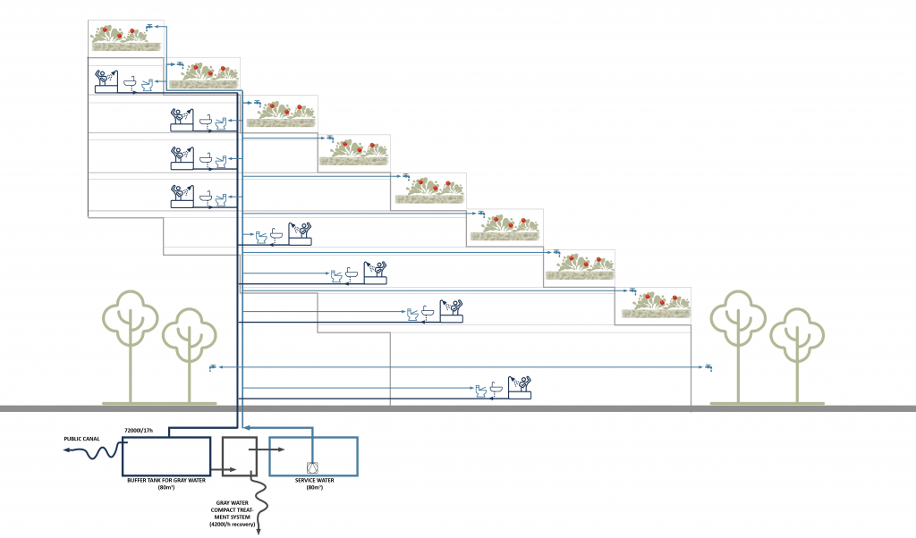 Modern compact water treatment plants recycle 95% of the greywater. To not treat more water than needed a buffer tank will manage the surplus with a spillover into the public sewer system. 42000l per hour are recovered on average. The system automatically stops treating when the service water tank is full. With this system, the demand for irrigation and toilet flushing can be constantly supplied!