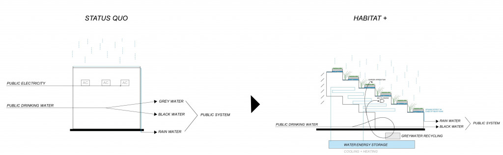 Compared to the status quo building, HABITAT+ reacts to increasing water scarcity. To use water as a resource sparingly, greywater gets recycled. Greywater includes wastewater from the shower and hand basin. With the treatment of this water, 100% of the demand for garden irrigation as well as toilet flushing is permanently covered.